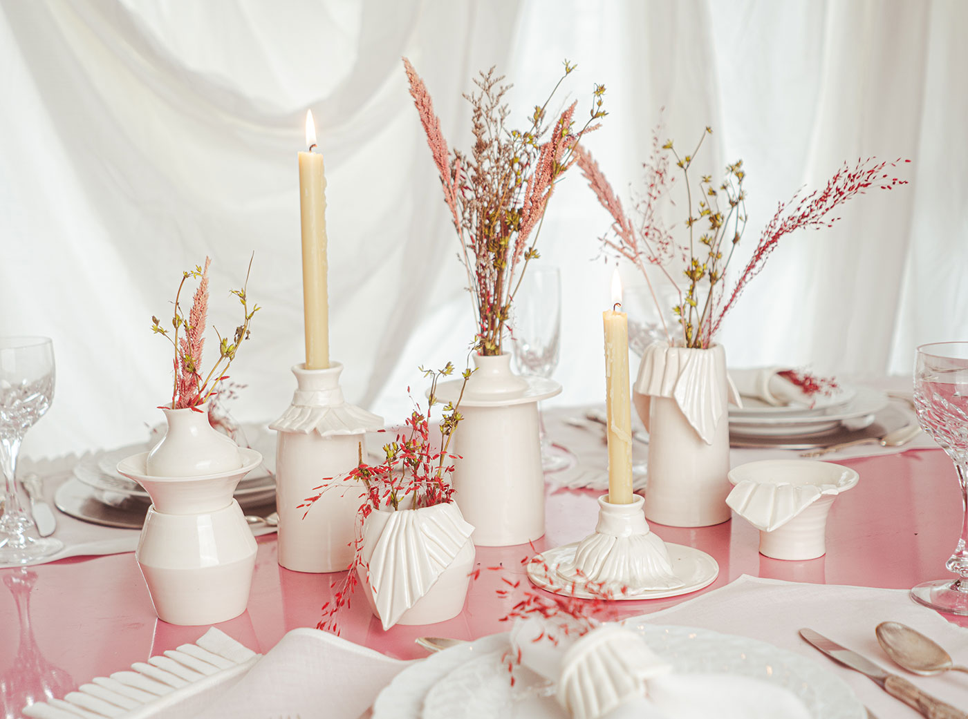 Working with modularity and pleats, both core elements of Mich Dulce’s distinct aesthetic, the collaboration yields a collection of multi use ceramics that can be combined in unlimited ways. The Japanese stoneware tablescaping collection created with Bumi & Ashe includes two part vases, bud vases, tea light holders, and napkin rings, alongside table linens produced at the Mich Dulce studio to complement the collection. With the addition of various ceramic adaptors, each vase takes on a different shape or even a new function if utilised as a candle holder. Each piece is available in two version, Plain, a minimalist version and Pleat, a version with a little bit of extra. The pieces allow for each user to assemble the ceramics whichever way they favor, exploring creativity in line with Bumi & Ashe’s mission that everyone is an artist.