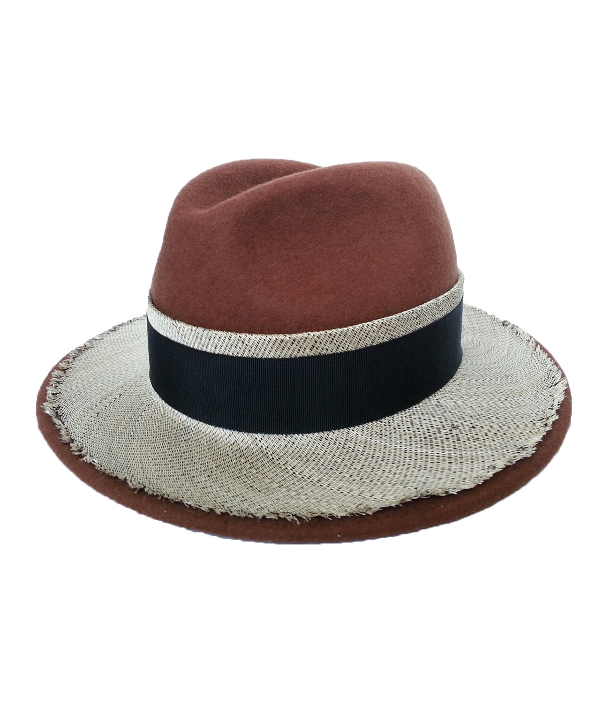 Hand blocked wool felt hat trimmed with T’nalak, a hand woven fabric made by the T’boli tribe of South Cotobato, and English grosgrain